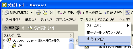 1.アウトルックを起動して、「ツール(T)」→「オプション(O)」をクリックします。