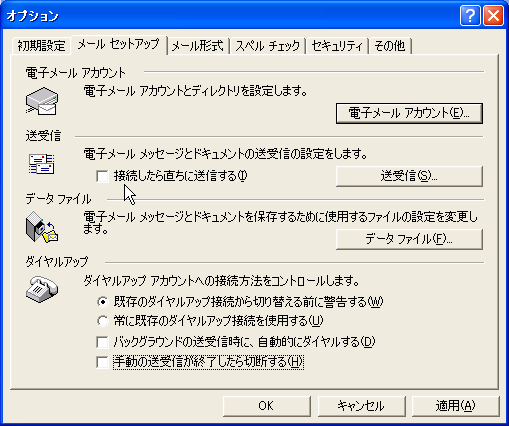 (outlook2000の場合は、さらに接続タブから、「送受信が終了したら切断する」のチェックをはずす必要があります。)
